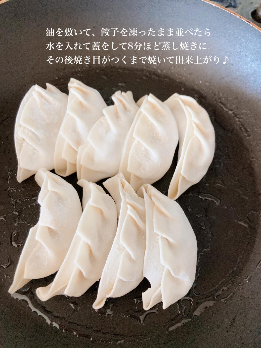 凍ったままフライパンに並べて蒸し焼きにすること8分、蓋を開けて焼き目がついたら出来上がりです♩