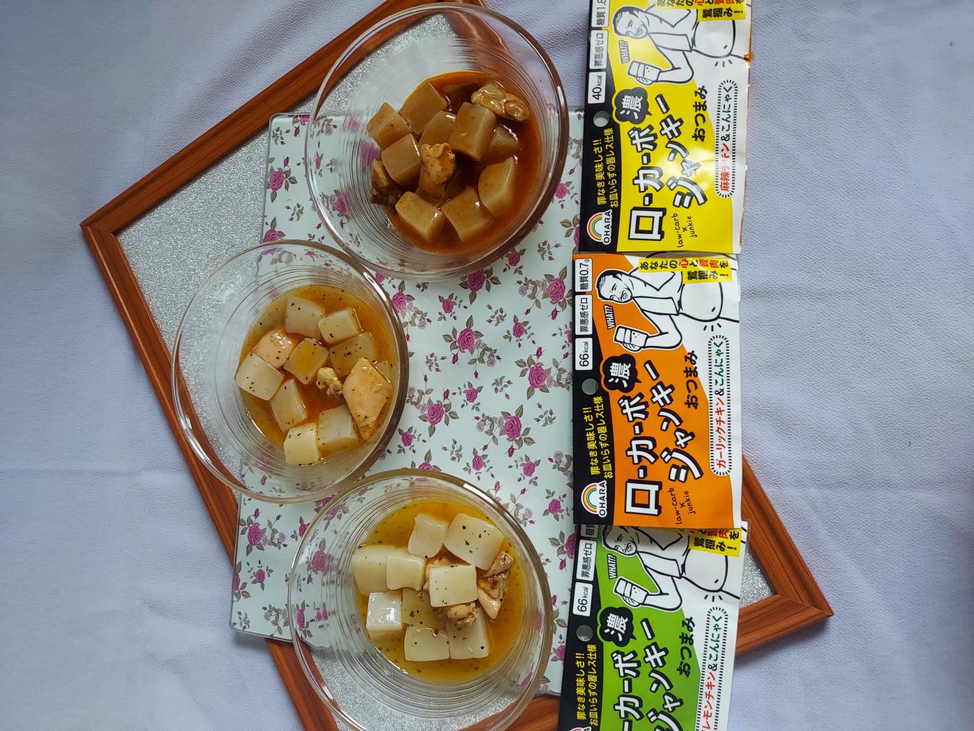 「麻辣チキンこんにゃく」「塩レモンチキンこんにゃく」「ガーリックチキンこんにゃく」の3種セットです。
