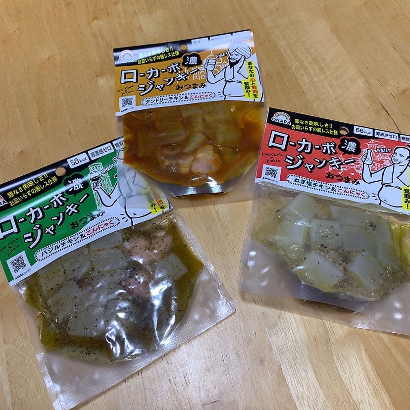 ローカーボジャンキーおつまみシリーズを試してみました。 バジルチキン&こんにゃく ねぎ塩チキン&こ...