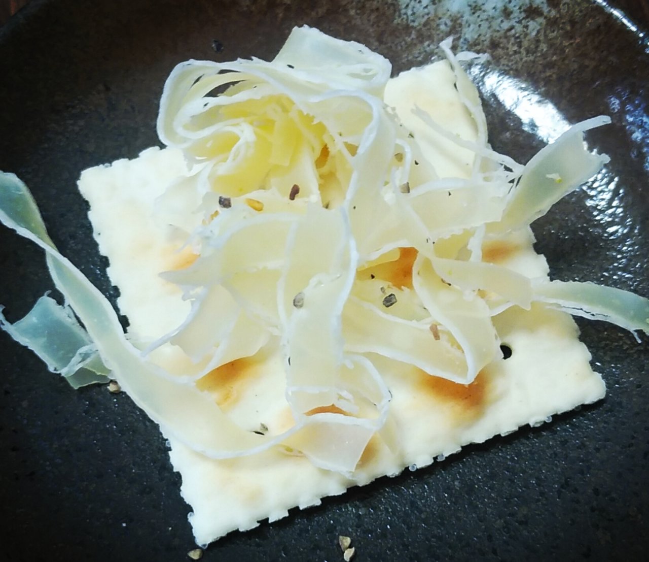 さらにオススメの食べ方はサラダ、パスタ、クラッカーなどにトッピングとのことで、早速クラッカーにのせて食べてみました。黒コショウを添えて。
