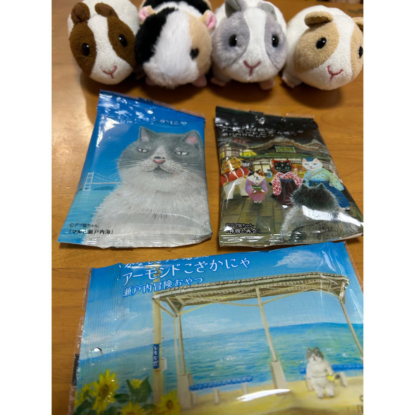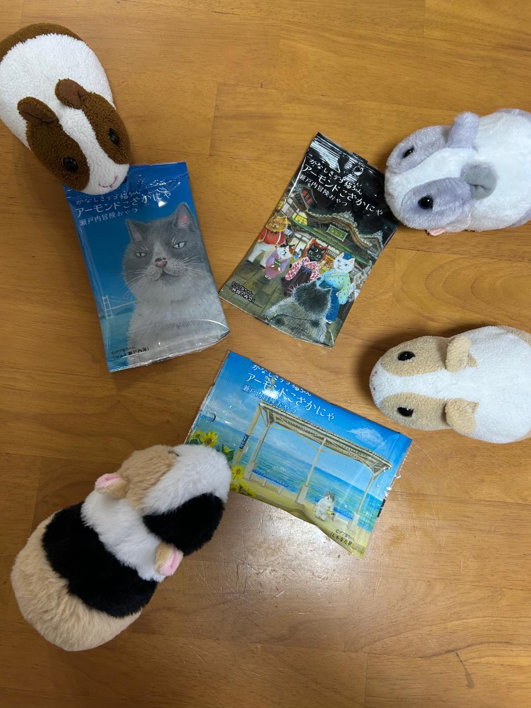 パッケージデザインは3種類あり、愛媛県、、兵庫県、広島県と瀬戸内海に面したエリアが舞台にした愛媛生まれの人気童話【かなしきデブ猫ちゃん】とタイアップしたおやつのようです。