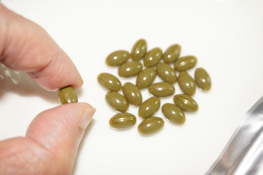 ソフトカプセルタイプのサプリで、色は濃い目のエメラルドグリーン。