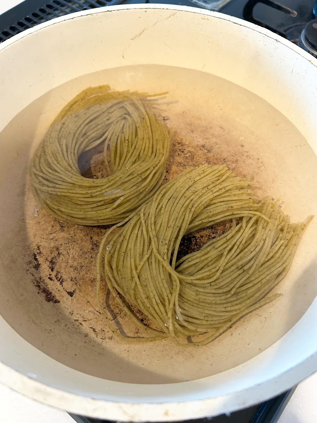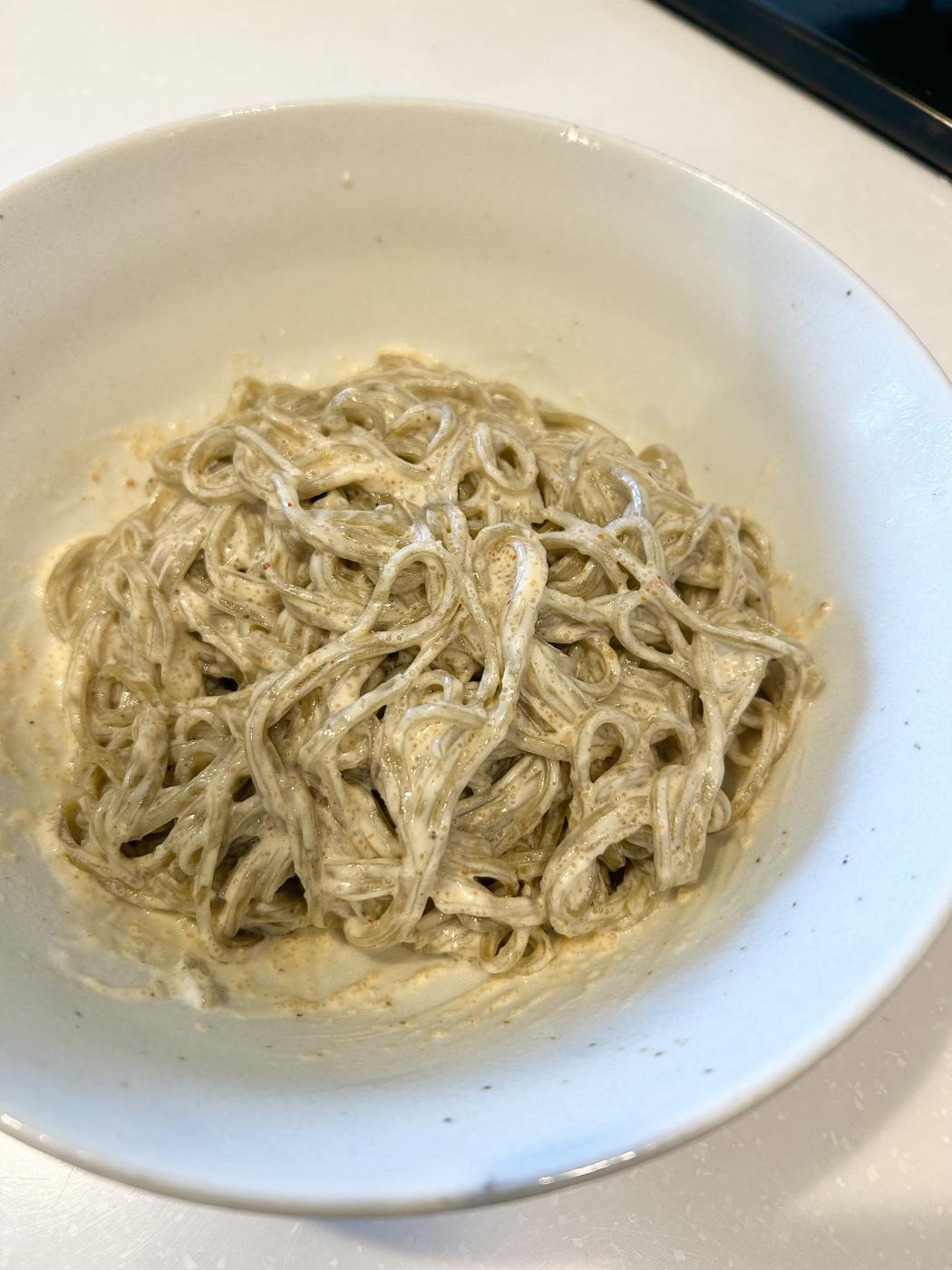 今回は明太マヨでアレンジしましたが、この選択が大正解でした。明太子とマヨネーズを合わせたソースに、少しだけゆで汁を入れて伸ばすと、あっぱれめんがほどよくソースをまとい、まろやかだけどくどくないバランスに仕上がります。米粉麺は小麦麺ほどソースを吸いすぎないので、食べ進めても味が濃くならず、最後の一口までずっと美味しいままなのが印象的でした。