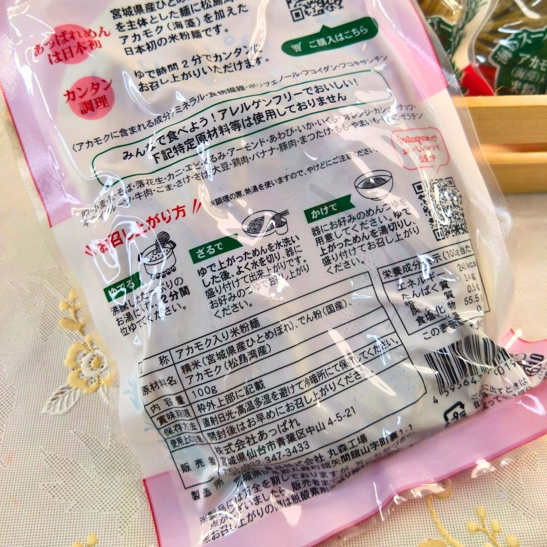 宮城県産ひとめぼれの米粉、北海道産ばれいしょでんぷんに、松島湾産の海藻「アカモク」で作られた