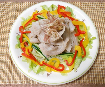 茹でたお肉は水にさらさずうちわで扇いで冷まし、たっぷりの野菜とみょうがをのせて出来上がり。