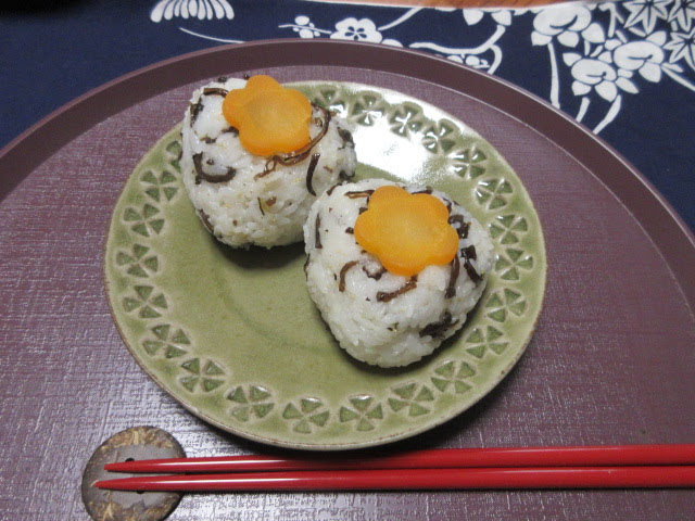 炊きたてのご飯を陶器の器に入れ、その上に子持ちきくらげを乗せてよく混ぜ合わせてみました。混ぜ合わせる時に紫蘇の香りが当たり一面に漂うのですが、この香りだけで「美味しい!」という確信が持てました(笑)その後でおにぎりの形にし、くり抜いた人参を添えて「子持ちきくらげのおにぎり」の完成です♫