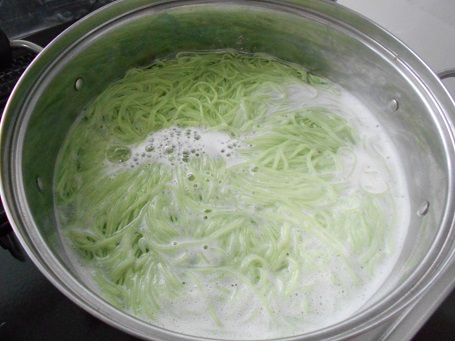 オリーブの実をペースト状にしておそうめんに練りこんであるので、とっても綺麗な緑色をしています。