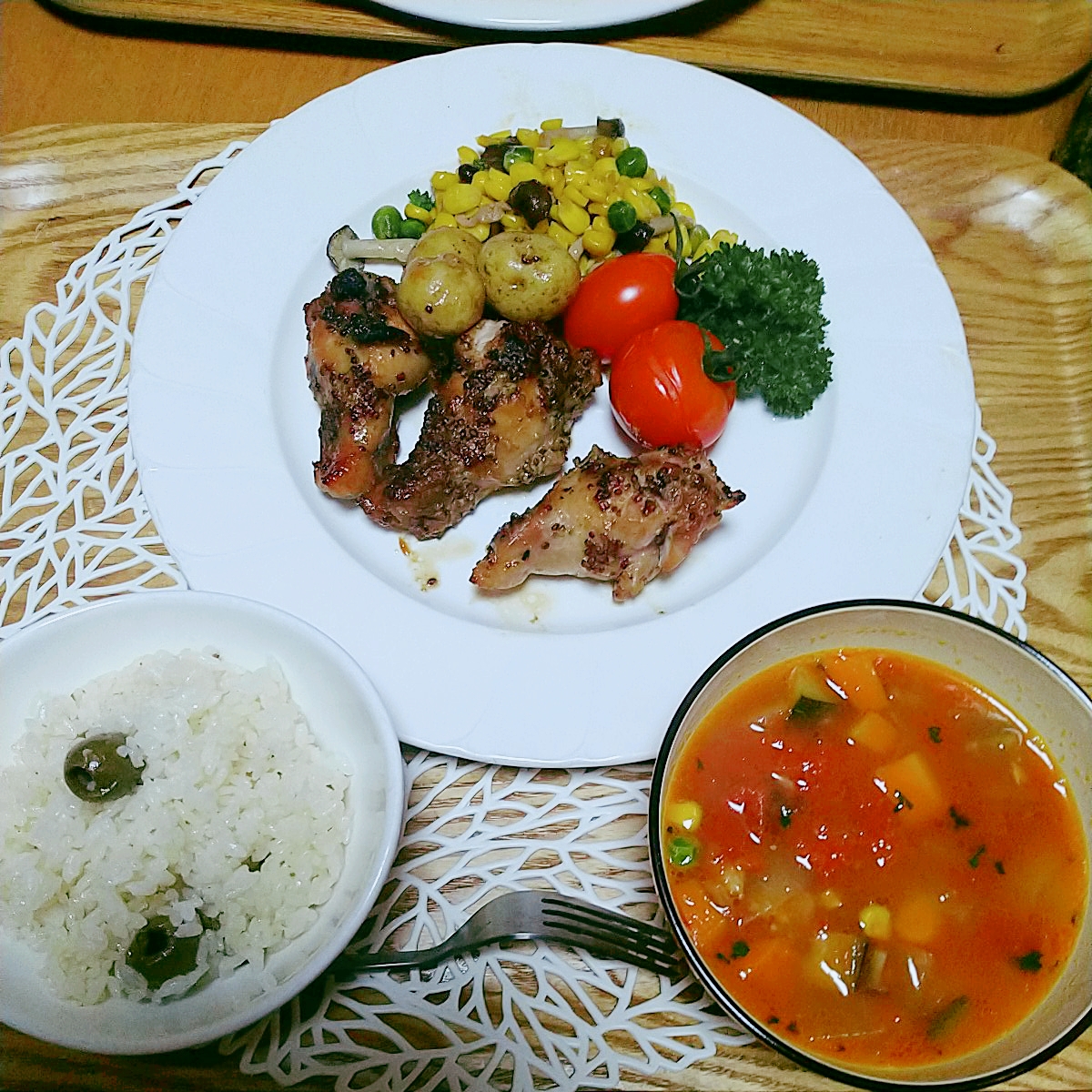 今日の晩御飯はミネストローネスープとマスタードチキン付け合せの野菜。