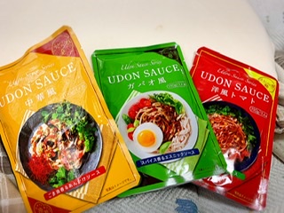 中華風、洋風トマト、ガパオ風の3種類があり、ソースを茹でたうどんにかけるだけで出来てしまう、うど...
