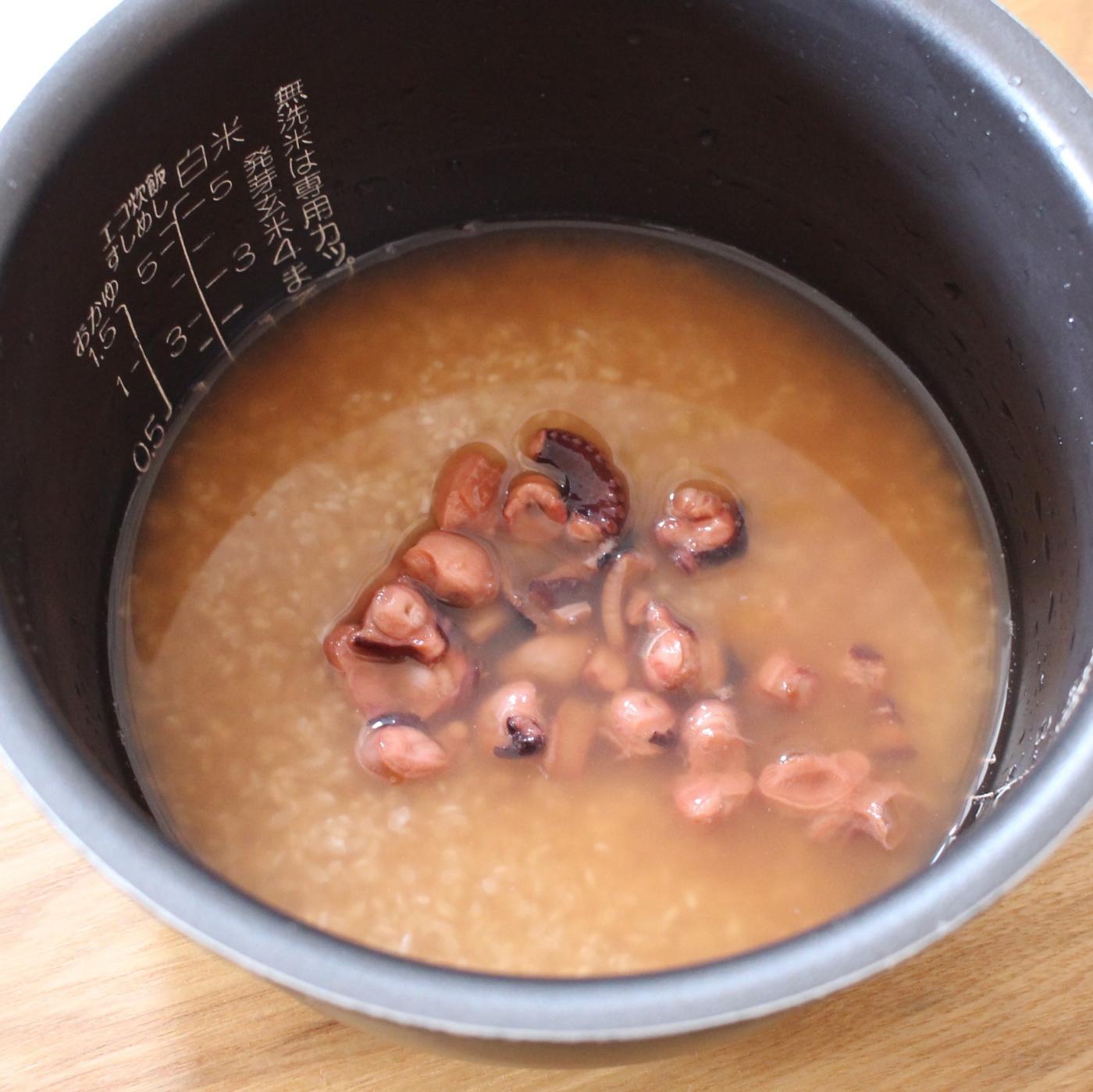 お米2合をといで、液ごとたこめしの素を加え、2合の水加減になるように水を足します。