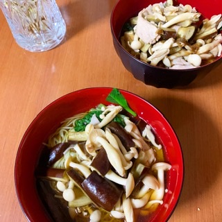 豚肉、ナス、しめじ、小松菜を入れて夫が煮麺を作ってくれました?