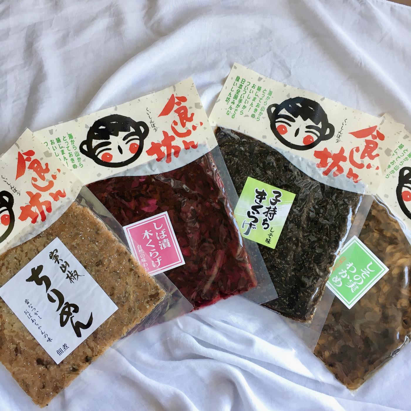 セットの中身は、子持ちきくらげ・ちりめん山椒・しば漬木くらげ・しその実わかめ の4種類。