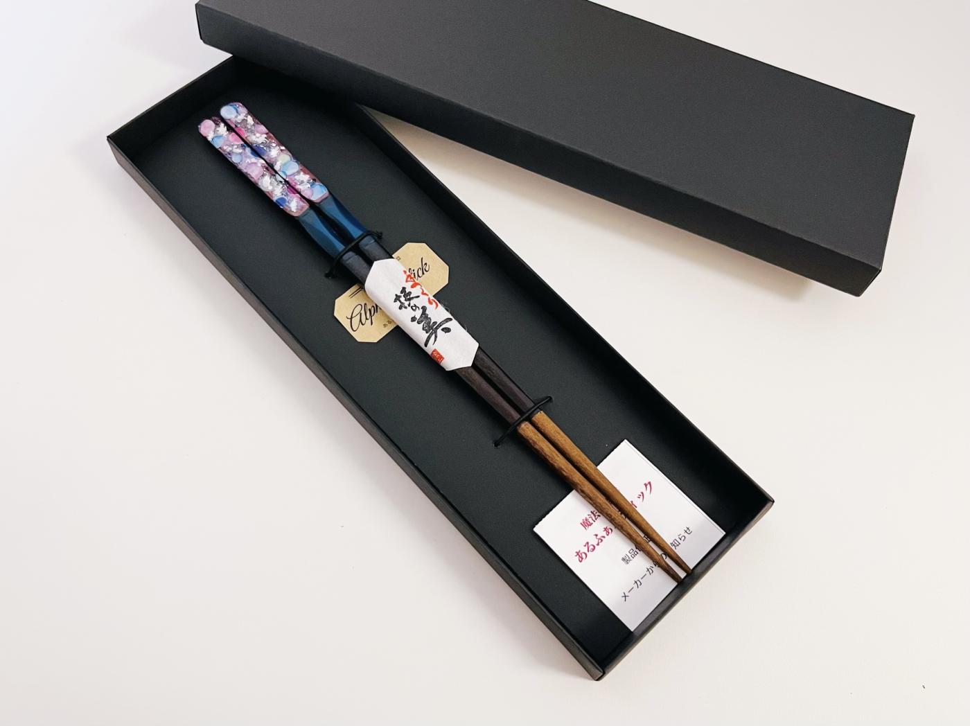 その中でも、『Ma&Miシリーズ』は、スティックアーティストの『Ma-Chan(まちゃん)』と『Mi-Chan(みちゃん)』が、あるふぁスティックの既製品(商品名:黄金)を加工して、スティックアートを施した、存在感抜群のちょっと贅沢なお箸。