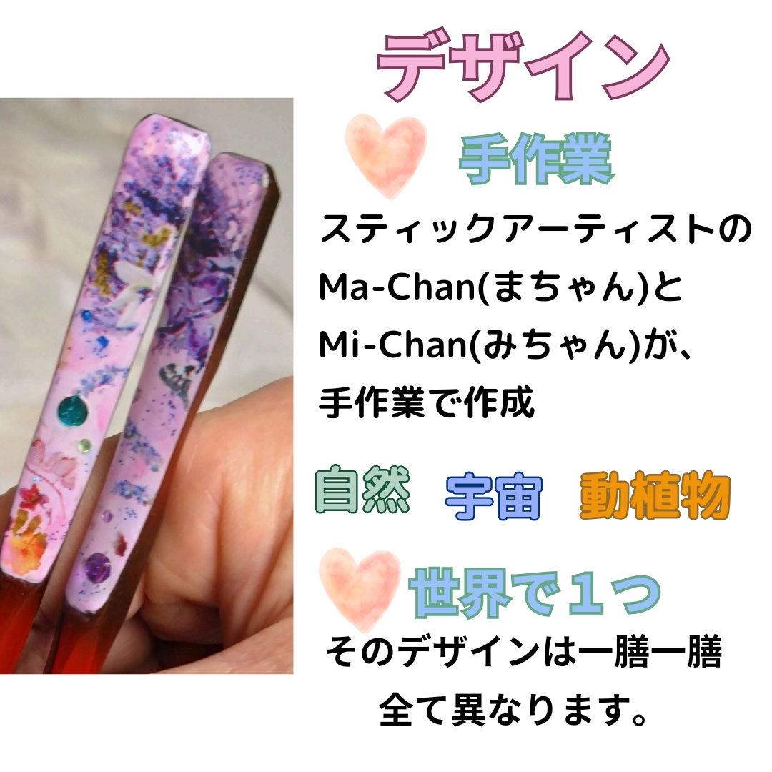 一膳一膳「自然」「宇宙」「動植物」をモチーフに、インスピレーションを大切に作られている為、同じデザインのものがない、 世界で1つだけのお箸なんです。