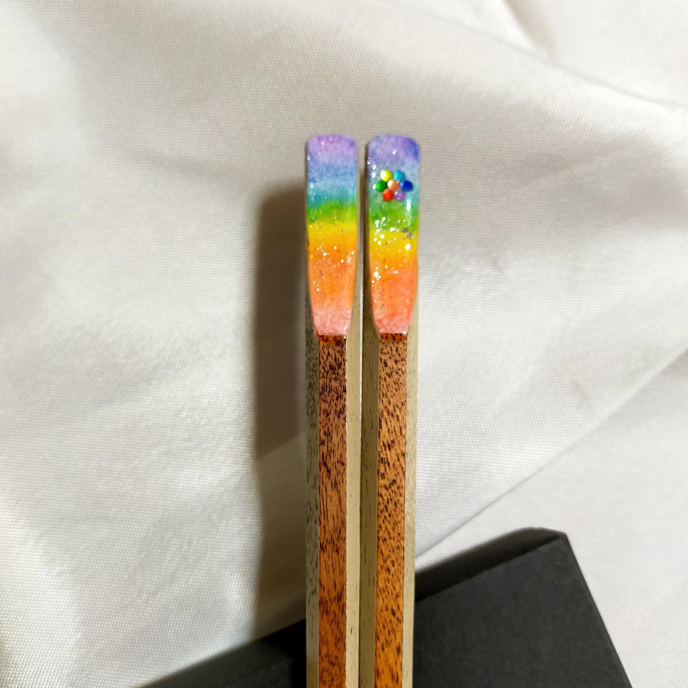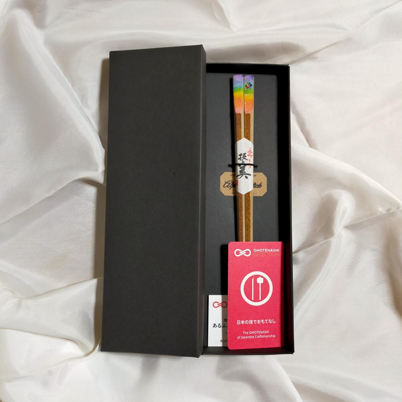 私がいただいたお箸は箸の持ち手部分に虹のようなデザインにラメが施され、お花をモチーフにした