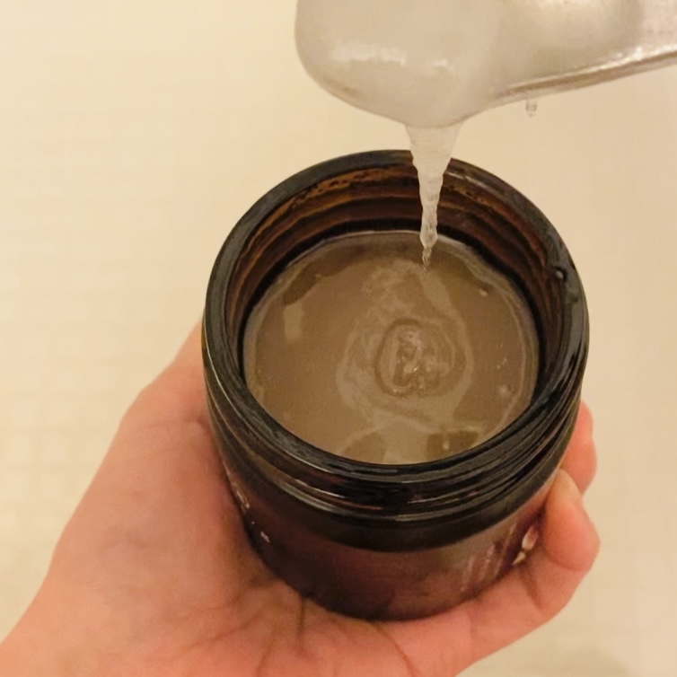 瓶を開けるとオイルとソルト の2層に分かれています、ボディスクラブとしてもバスソルトとしても使えます、使用前にスパチュラで混ぜてから使います、付属のスパチュラがステンレスタイプで使いやすいですね、オイルとソルトをしっかり混ぜていくと程よいなめらかさに、使い始めはしっかり混ぜないと下側にソルトが沈んでいるので根気良く混ぜます