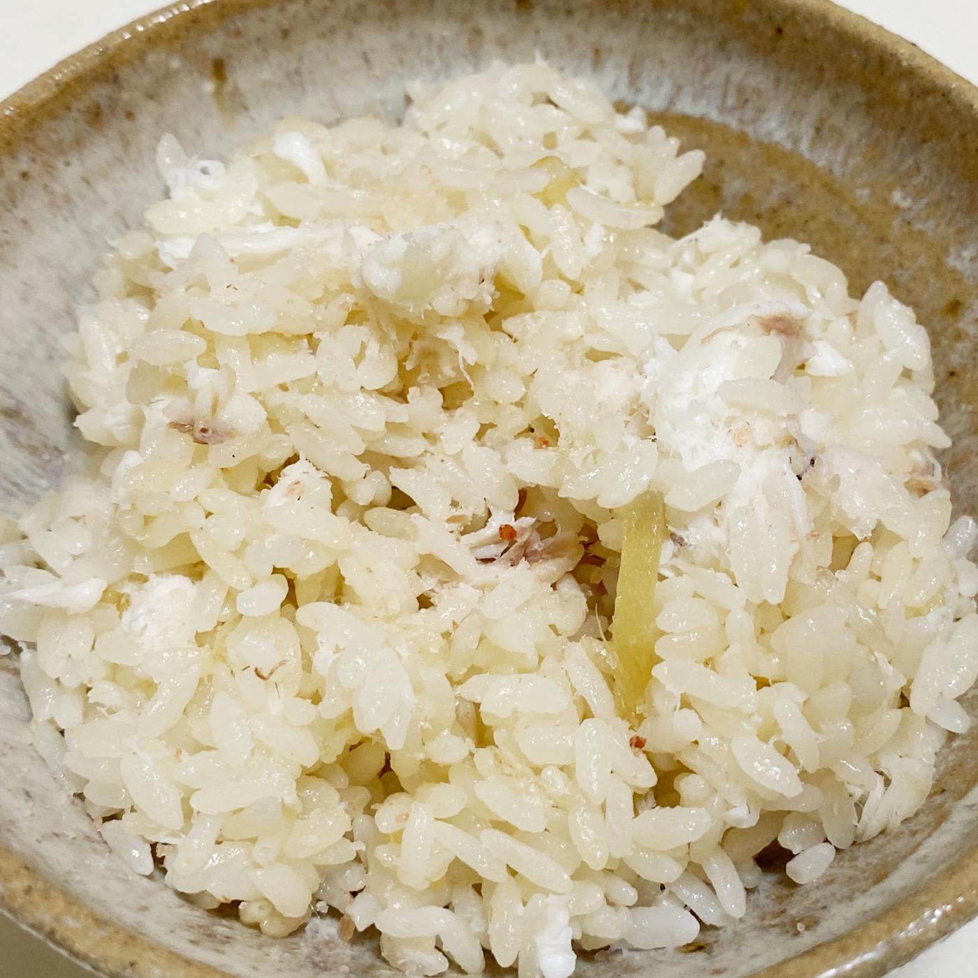 研いだお米の上に、骨とお顔、刻み生姜、醤油・酒で少し味を付けて、炊飯器のスイッチをON!