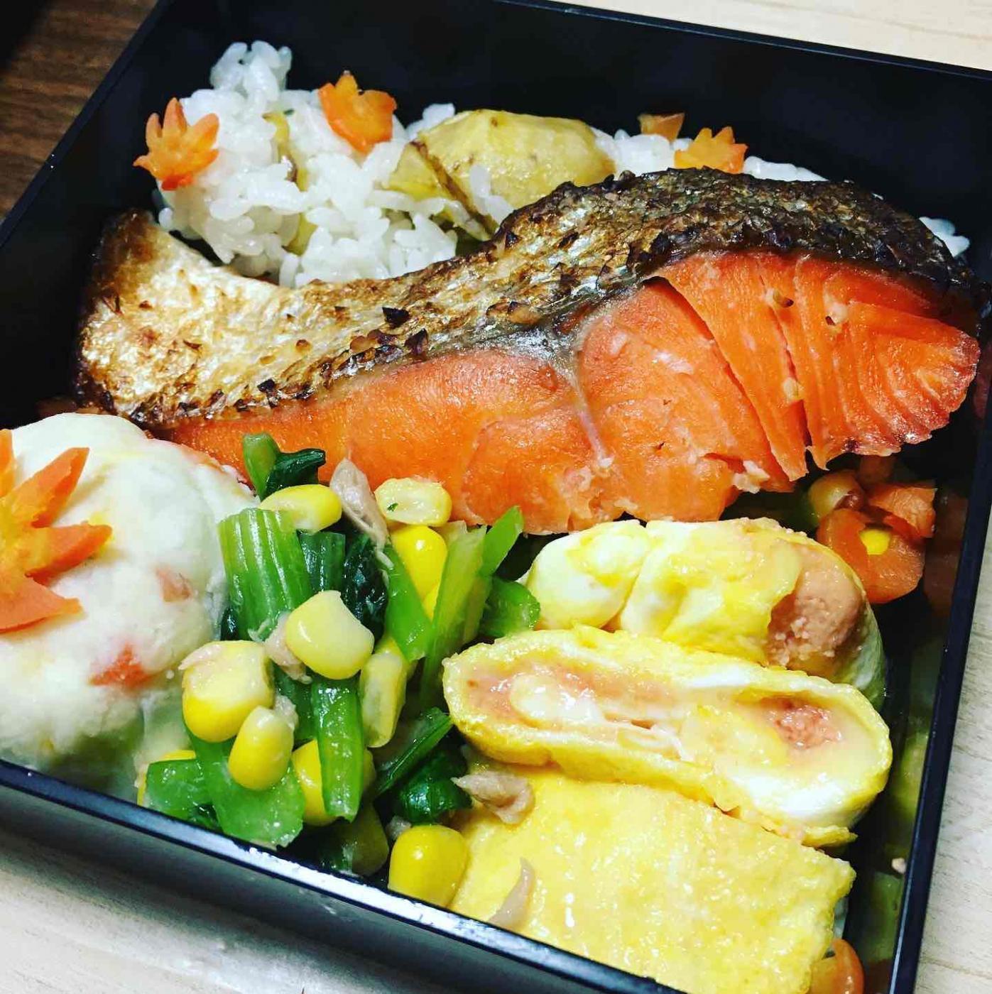 ちょうど秋で鮭といえばお弁当だ!と思ったので、秋を詰めたお弁当風にしていただきました。