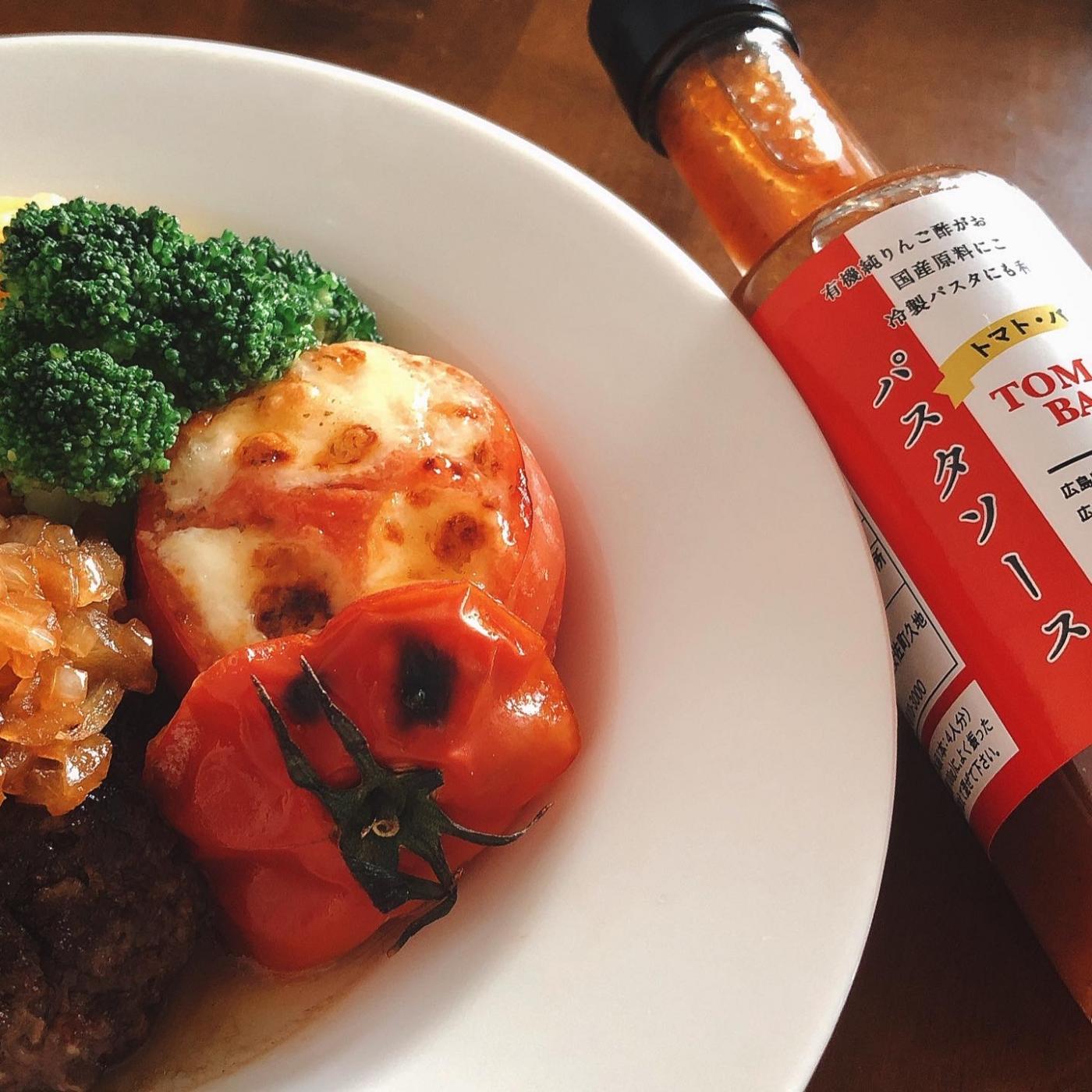 パスタにかけるだけでおうちごはんがワンランクアップする万能パスタソースを使い、今回は焼きトマトモッツアレラを作ってみました。