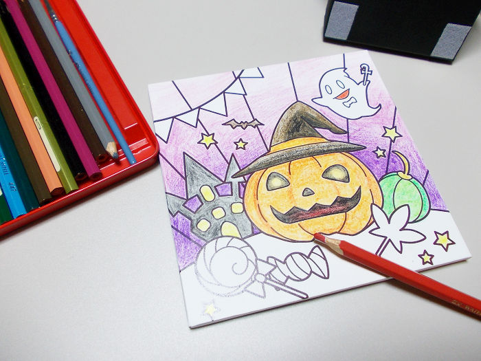 今回はハロウィンをテーマにした塗り絵でした。小さなお子さんでも塗れそうなシンプルな