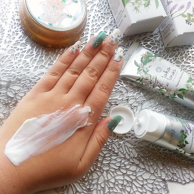 1回の使用量はパール玉くらい。少量でしっとり潤うので、手の乾燥具合で使う量を増やしたり、減らしたりしています。クリームはなめらかで伸びがよく、お肌にスーッと馴染みます。肌馴染みがいいので、ベタベタしません。
