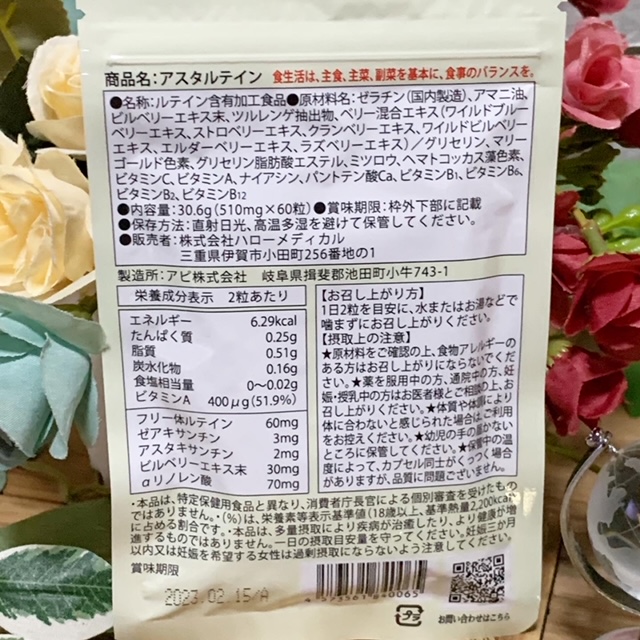 2粒あたりにフリー体ルテイン60g、ゼキサンチン3mg、ビタミンA400μg、アスタキサンチン2mg、マルチビタミン、ビルベリー末30mgが配合されています。