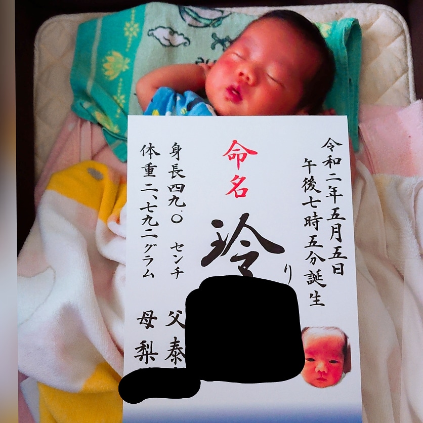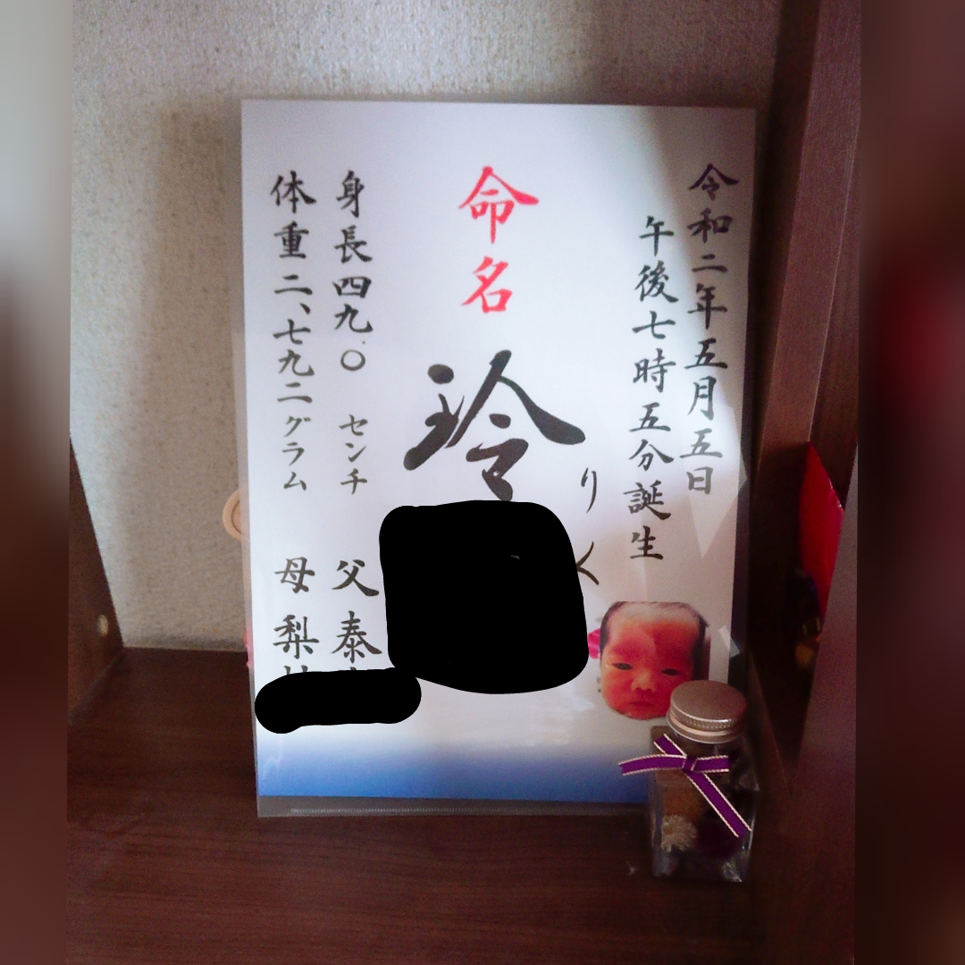 綺麗な字に、息子の顔写真の命名書。