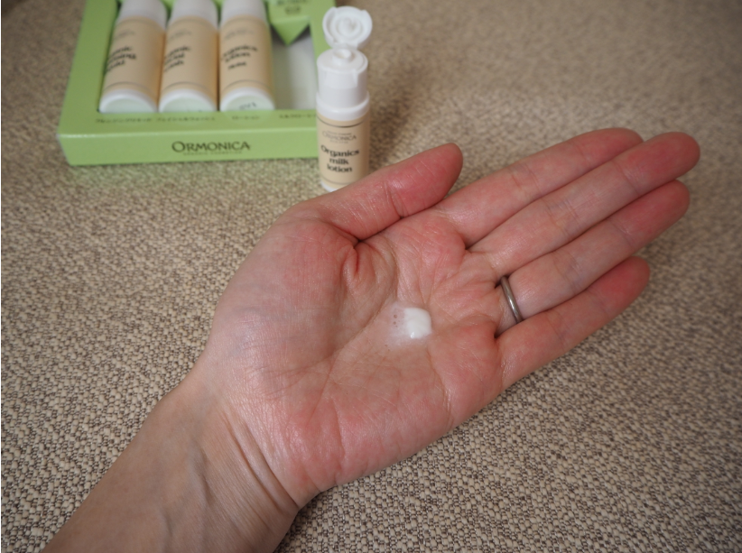 続いて、乳液。乳液は柔らかい白のテクスチャーでした。他の商品と同じく香りは柑橘系。保湿力というよりは、肌が柔らかくなる感じでしょうか。