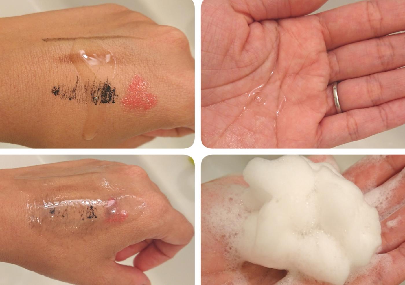 クレンジングはリキッドタイプということで、サラサラしていて、なじませていくだけでメイクが落ちていきます。ベタベタ感もないので、水でサラッとキレイに落とせました。