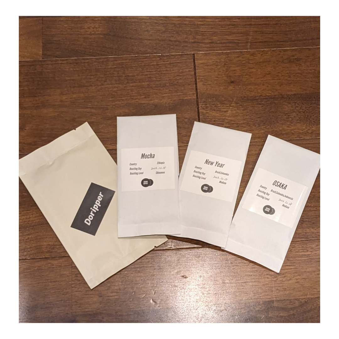 今回は、 MOKA、NEW YESAR、OSAKAの コーヒー3種類とドリッパーがセット。 1人分のドリパーがつ...