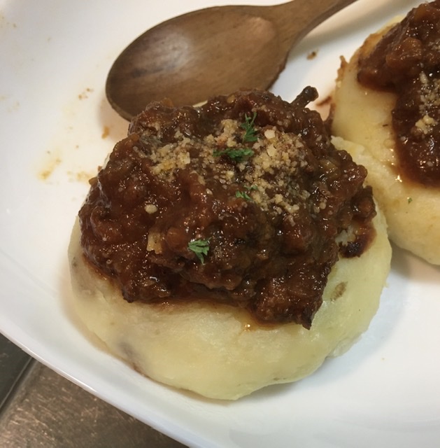 中からとろーりと出てくるいももちに、ミートソースのごろっとしたお肉の旨味が抜群でした!