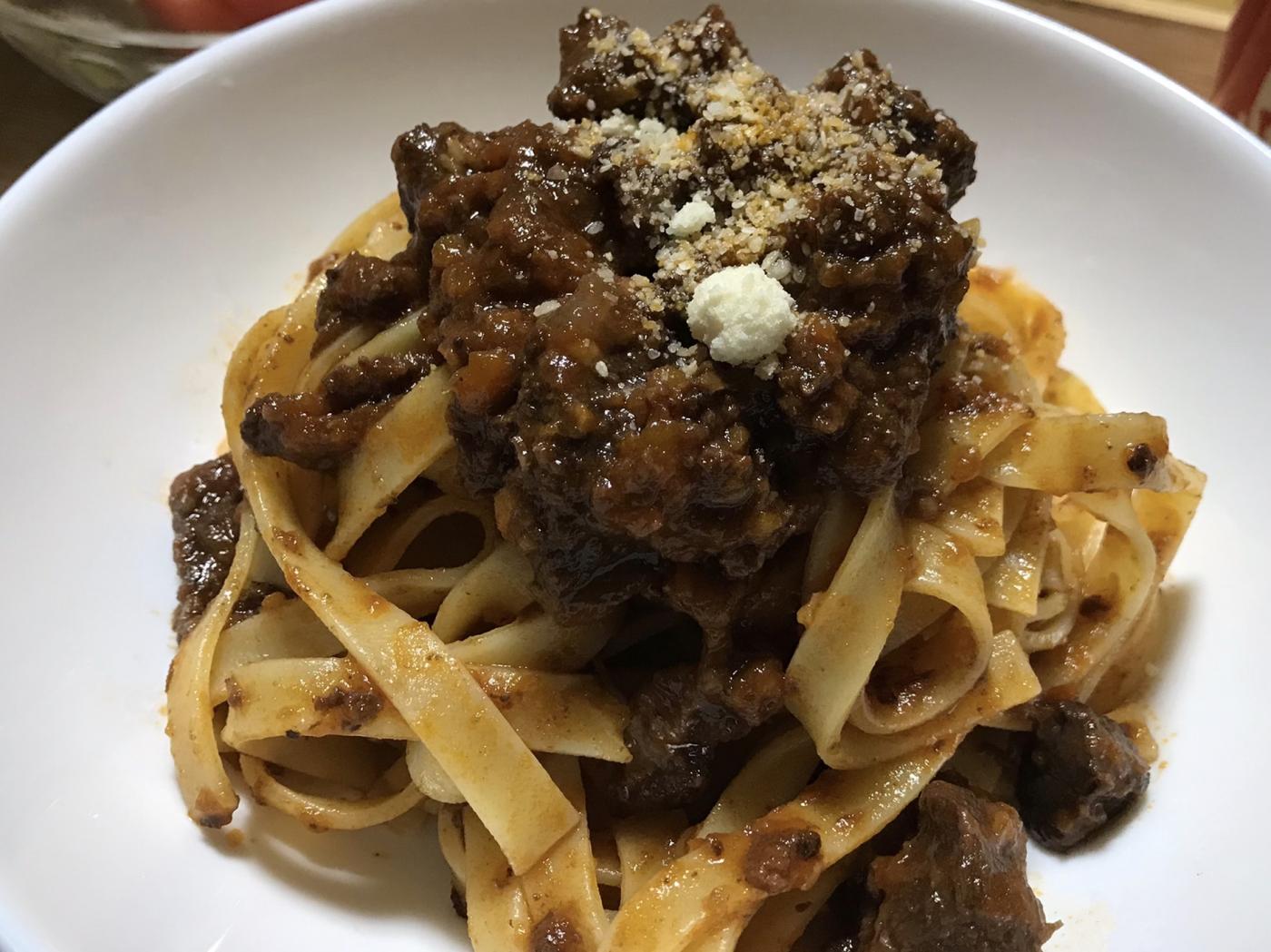 官能の牛ほほ肉ミートソース食べました。まずパッケージがオシャレで、スーパーに売ってるようなミートソースとは違うなと思いました。蓋を開け、見た目だけで判断すると、味がかなり濃そうと感じました。フライパンで熱していると赤ワインのような芳醇な香りが漂い、早く口の中で味わいたいとワクワクが増します。実際食べてみると濃すぎず程良い濃厚さで、とても食べやすかったです。牛ほほ肉が想像以上にゴロッと入っていて食べ応えがありました。私はフェットチーネでミートソースパスタを作りましたが、相性抜群でした。コロナの影響でおうち時間が増え、毎日の家の食事にも飽き始めていましたが、これを使えばいつもよりワンランク上のプチ贅沢なご飯が作れると感じました。次はラザニアやグラタンにも使ってみたいです。美味しかったです。