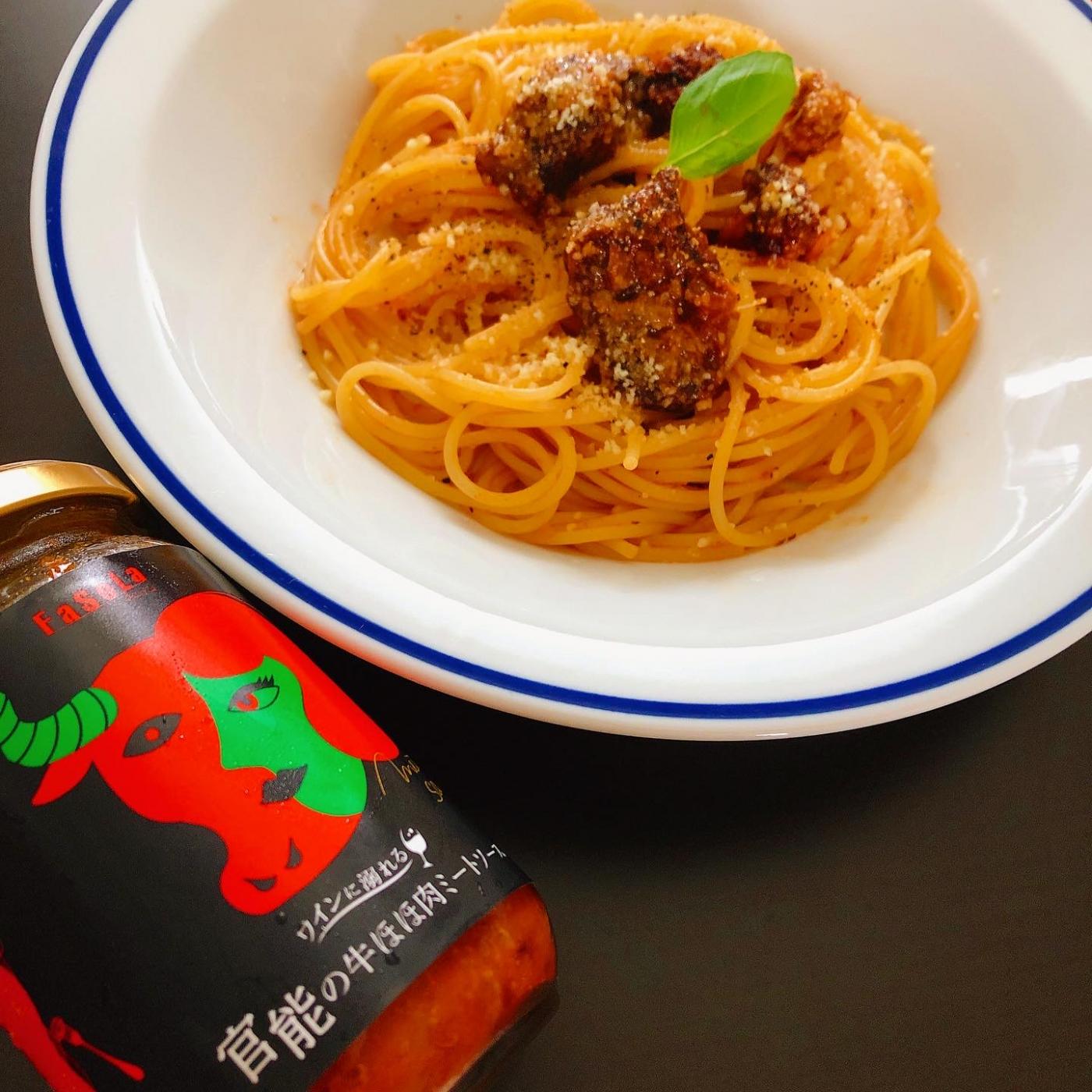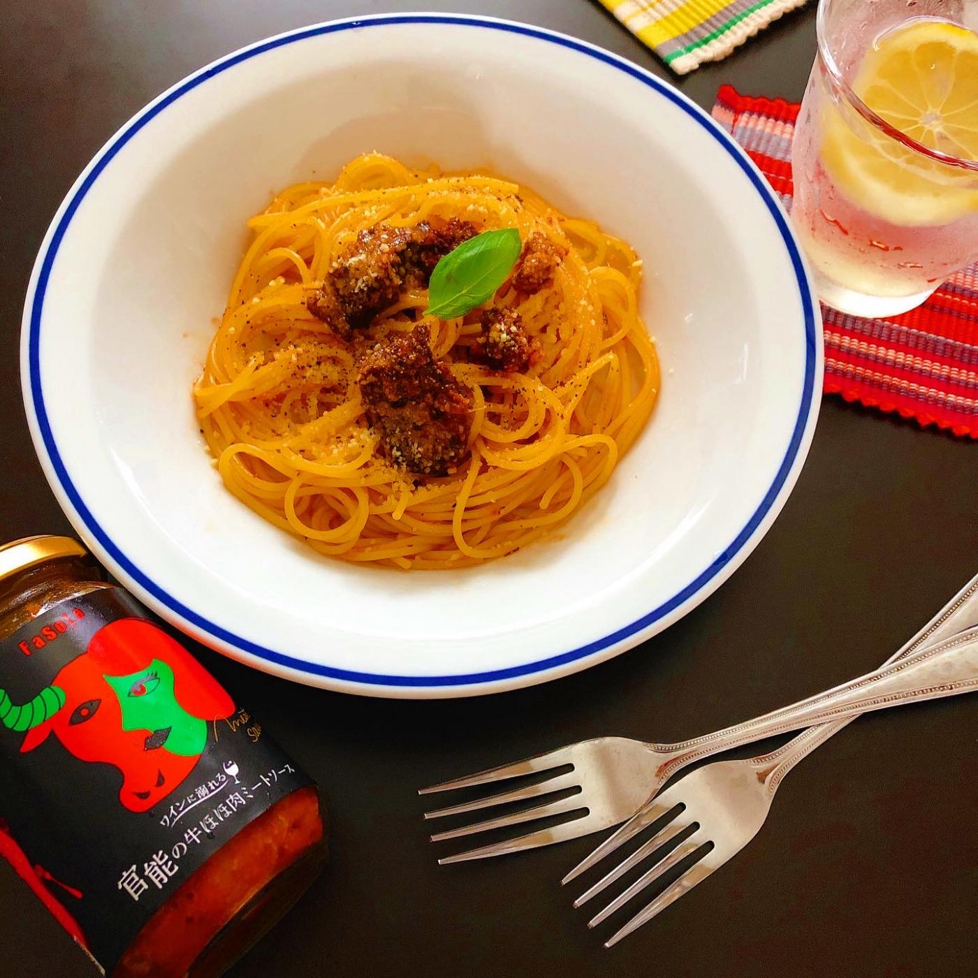 イタリア料理FaSoLaさんにモニターさせていただいた「官能の牛ほほ肉ミートソース 」を使って簡単パスタを作りました?