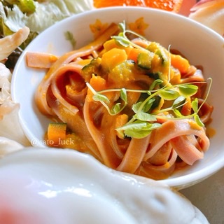カボチャのスープパスタと焼きそば風にしてみた😊