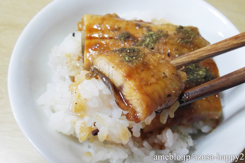 タレと粉山椒も付いていて、ほかほかご飯に鰻を乗せて、うな丼の完成です。