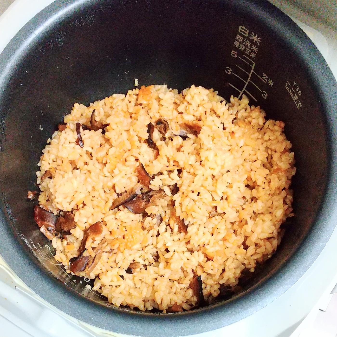 2合のお米を砥いで目盛りまで水を入れてから、この塩ふき椎茸を1袋全部入れて炊くだけでできあがり!