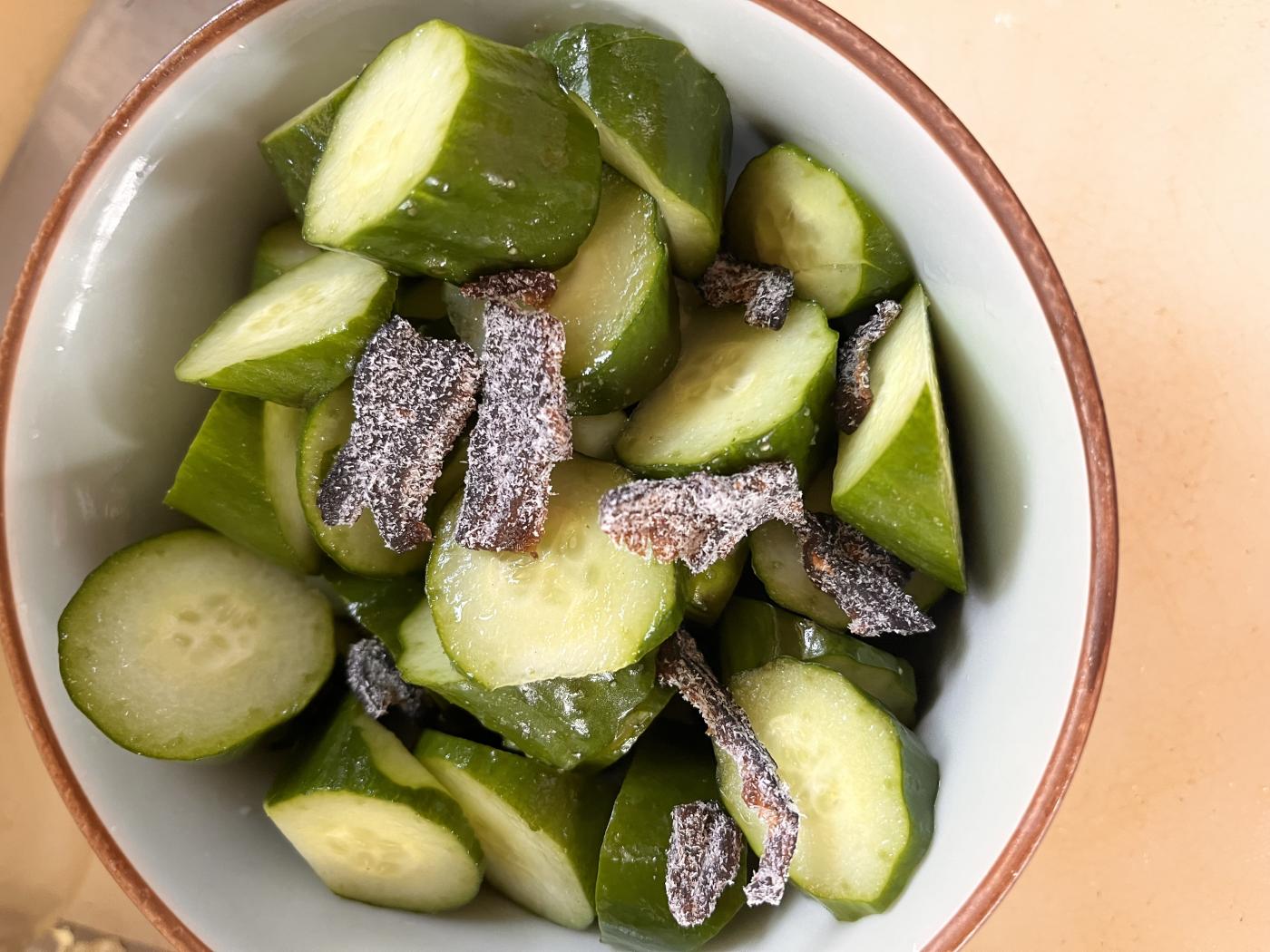 そこにこの塩ふき椎茸をひとつまみ。じんわりとキュウリに塩がまわればOKですが、ラッキョウ酢を入れてつけるのもありです。まろやか、実にまろやかなお味がしましたm(__)m