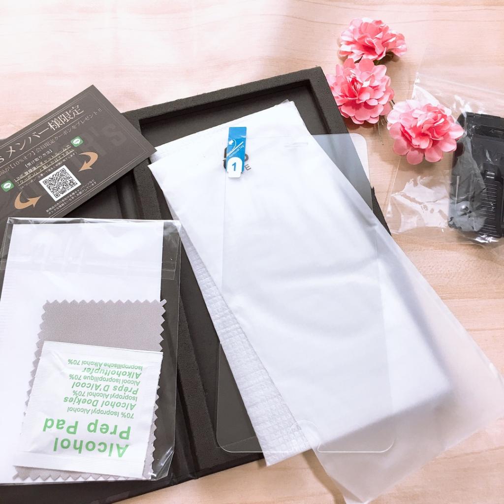 スマホの表面をアルコールパッドできれいにふき取り、その後シールで汚れを徹底的にとり、クロスで仕上げます。