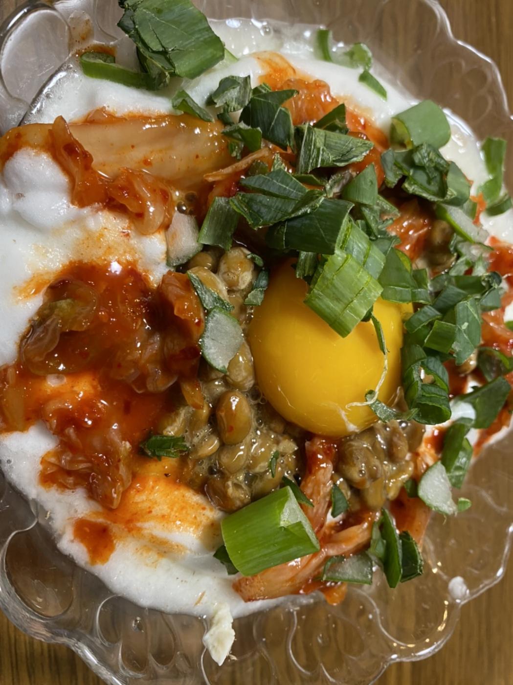 ホカホカのご飯の上にかけたら、その後は泡立てた卵白、納豆、キムチ、そして中央に卵黄とねぎを散らしたらあっという間に出来上がりです!!!