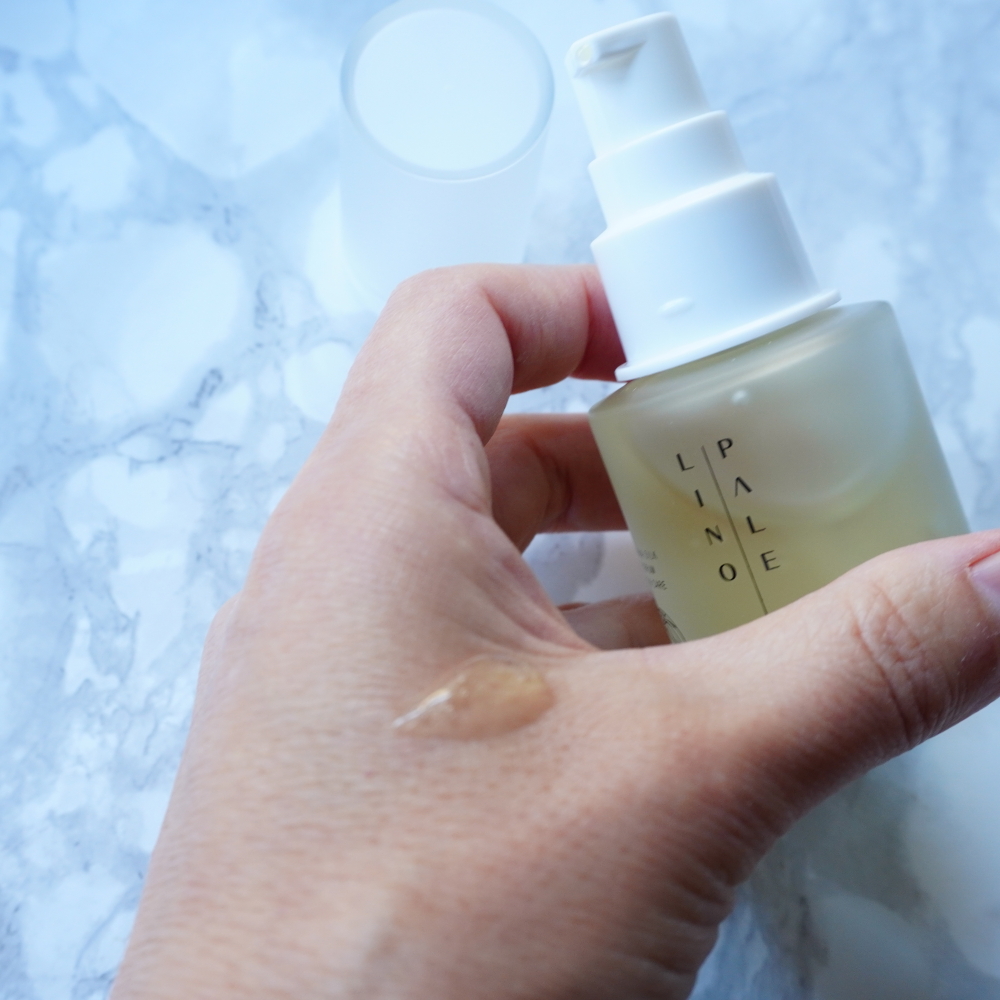 ①パレリノスキンセラムをパール大(ワンプッシュ)手にとり、両手に軽く広げます。
