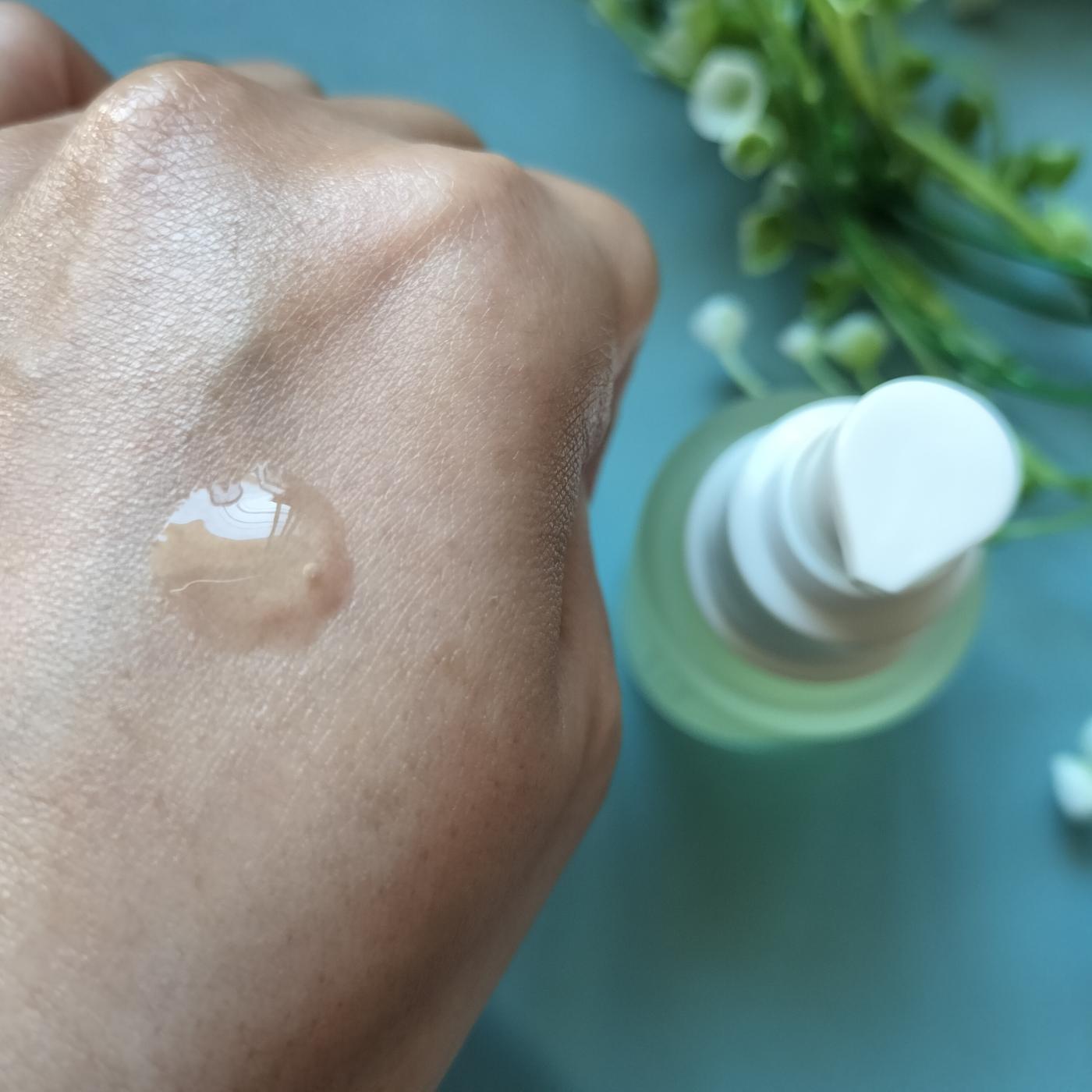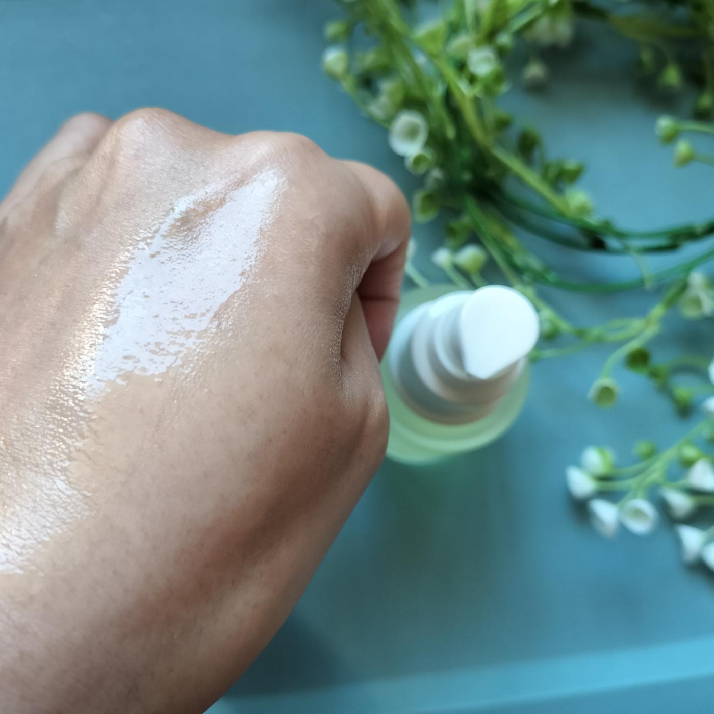 手に取ると、驚くほど軽やかでみずみずしいテクスチャー。とろみがあるのに、肌にのせた瞬間にスーッと吸い込まれるようになじみ、ベタつきが全く気になりません。お肌に乗せてからの浸透がとても速いのが特徴的です。
