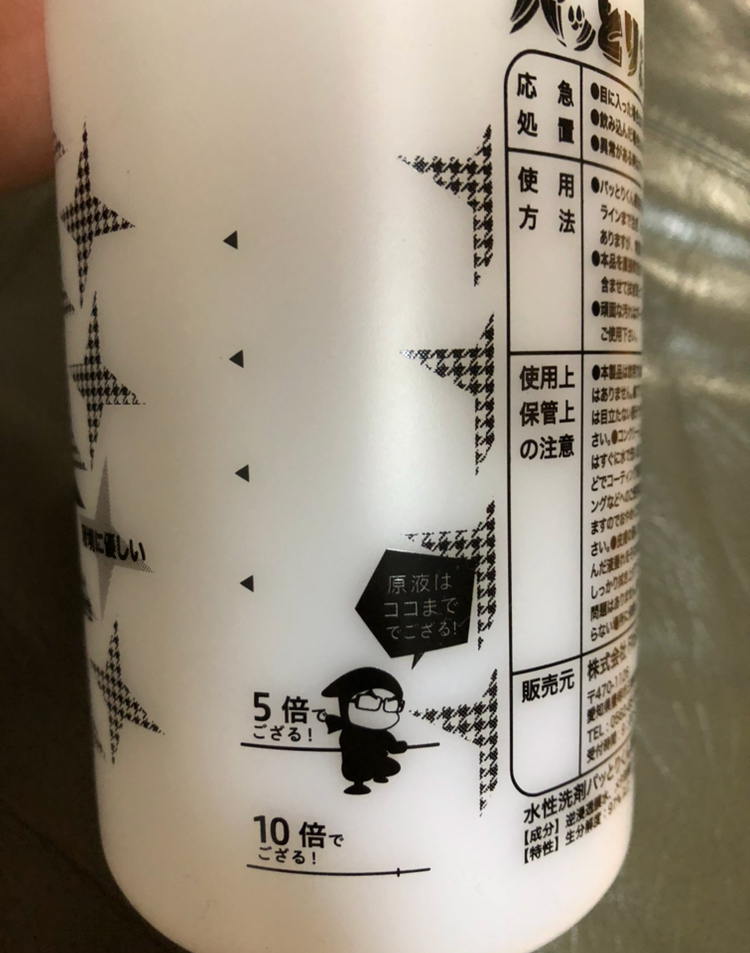 専用の希釈ボトルスプレー付きで、そのボトルには5倍や10倍に薄めるときのラインがついてるので、便利でした!