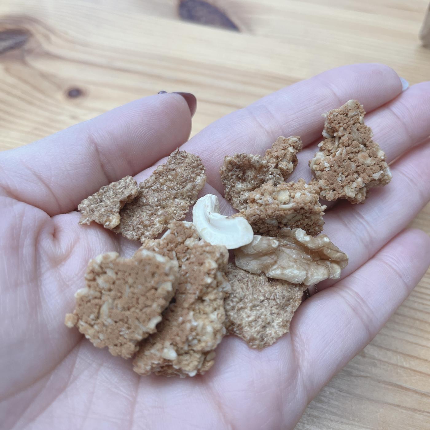 カシューナッツ、アーモンド、くるみ、レーズン、クランベリー、かぼちゃの種なども入っていて、良質なビタミン・脂質も一緒に摂れるし、いろいろな素材のゴリゴリ、ザクザク食感が楽しい。そのまま食べるのはもちろん、牛乳や豆乳をかけてシリアルの様に食べるのもオススメです✨