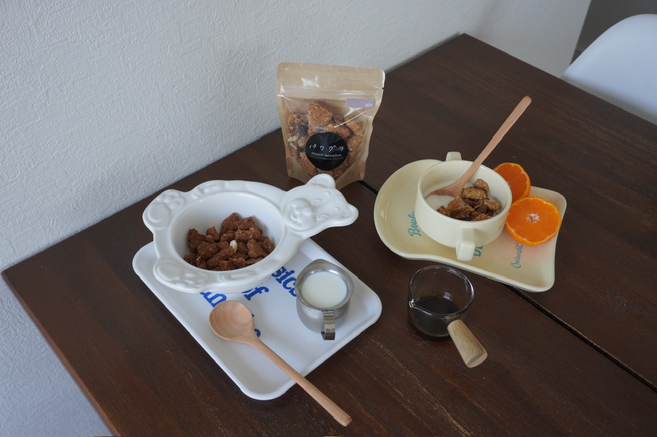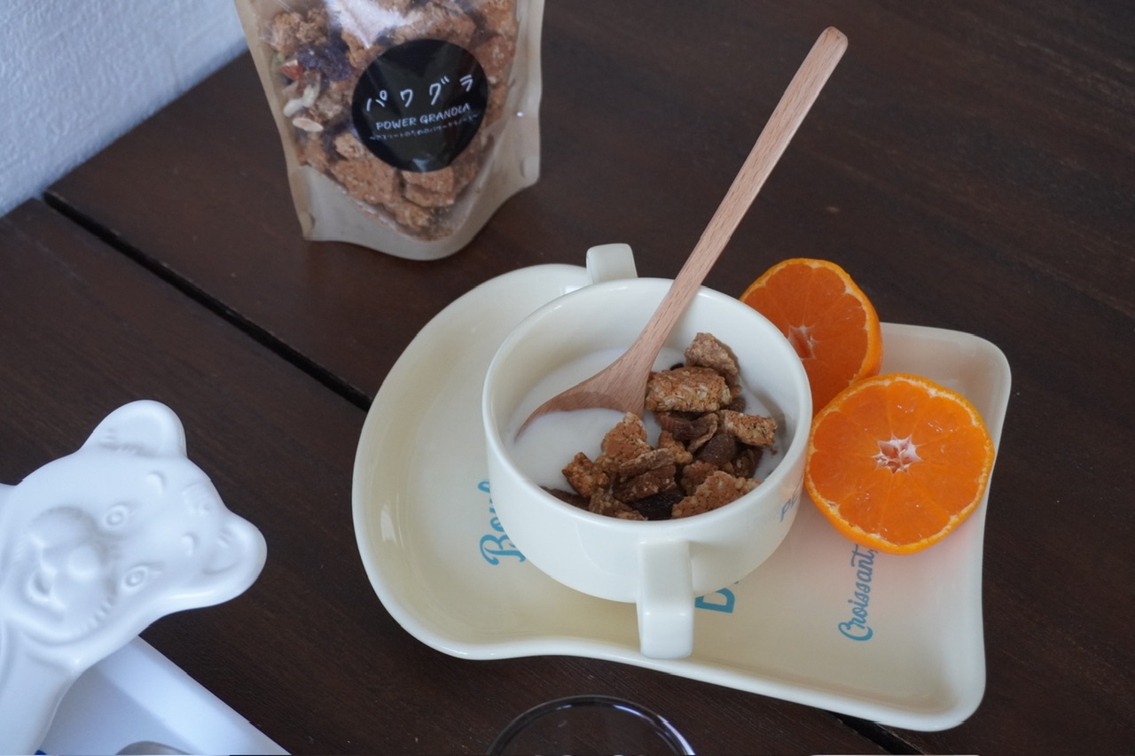どんなグラノーラかと言うと、オートミールとアミノ酸スコア100のソイプロテインを使用しており、良質なタンパク質が健康的な身体づくりを助け、1日に必要なタンパク質の約1/3がパワグラ1袋分で摂取できます!