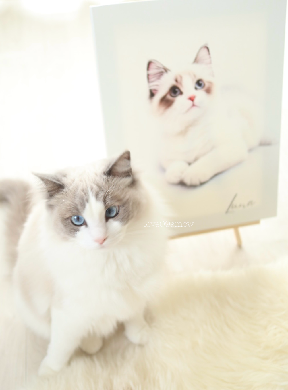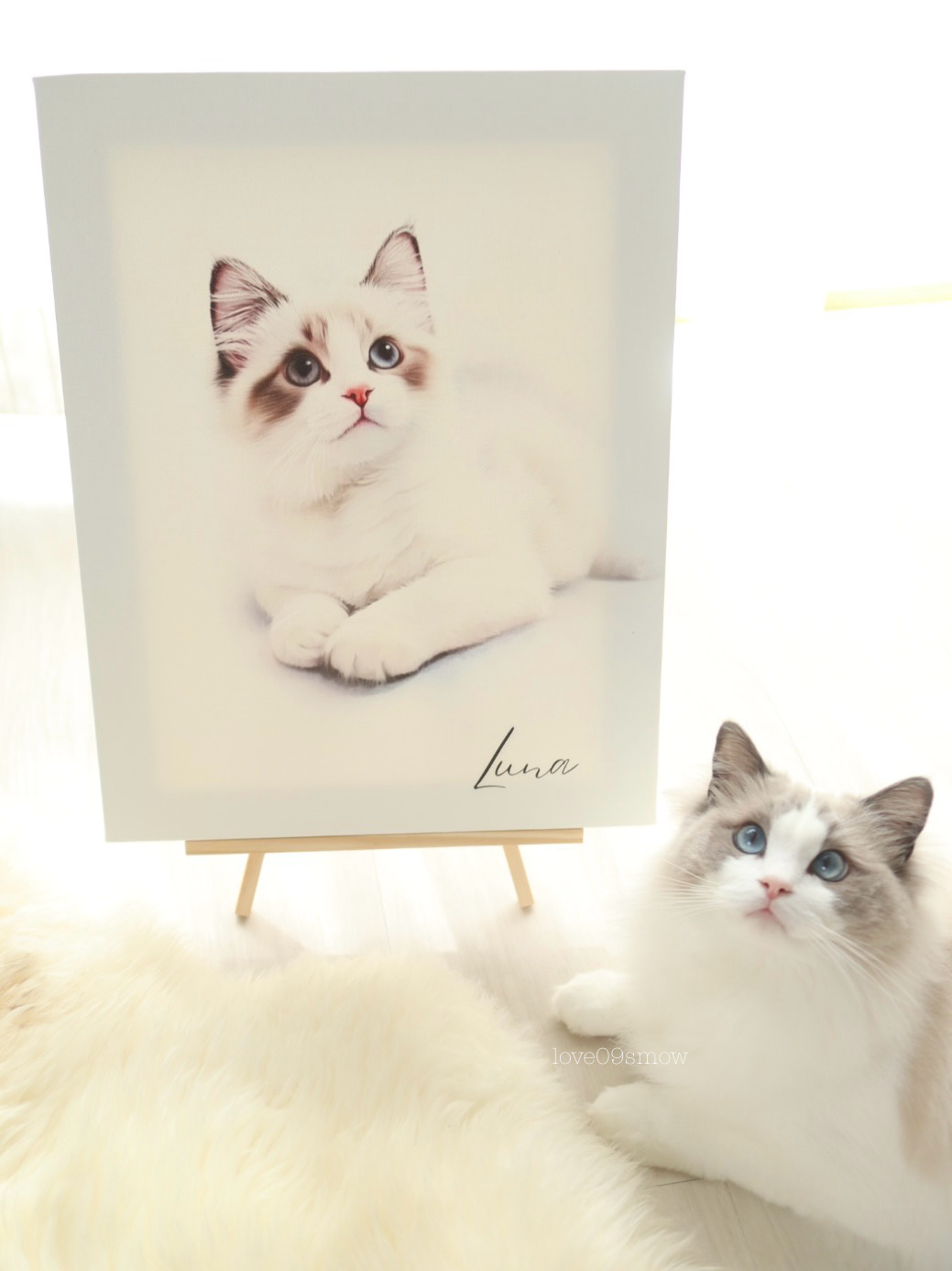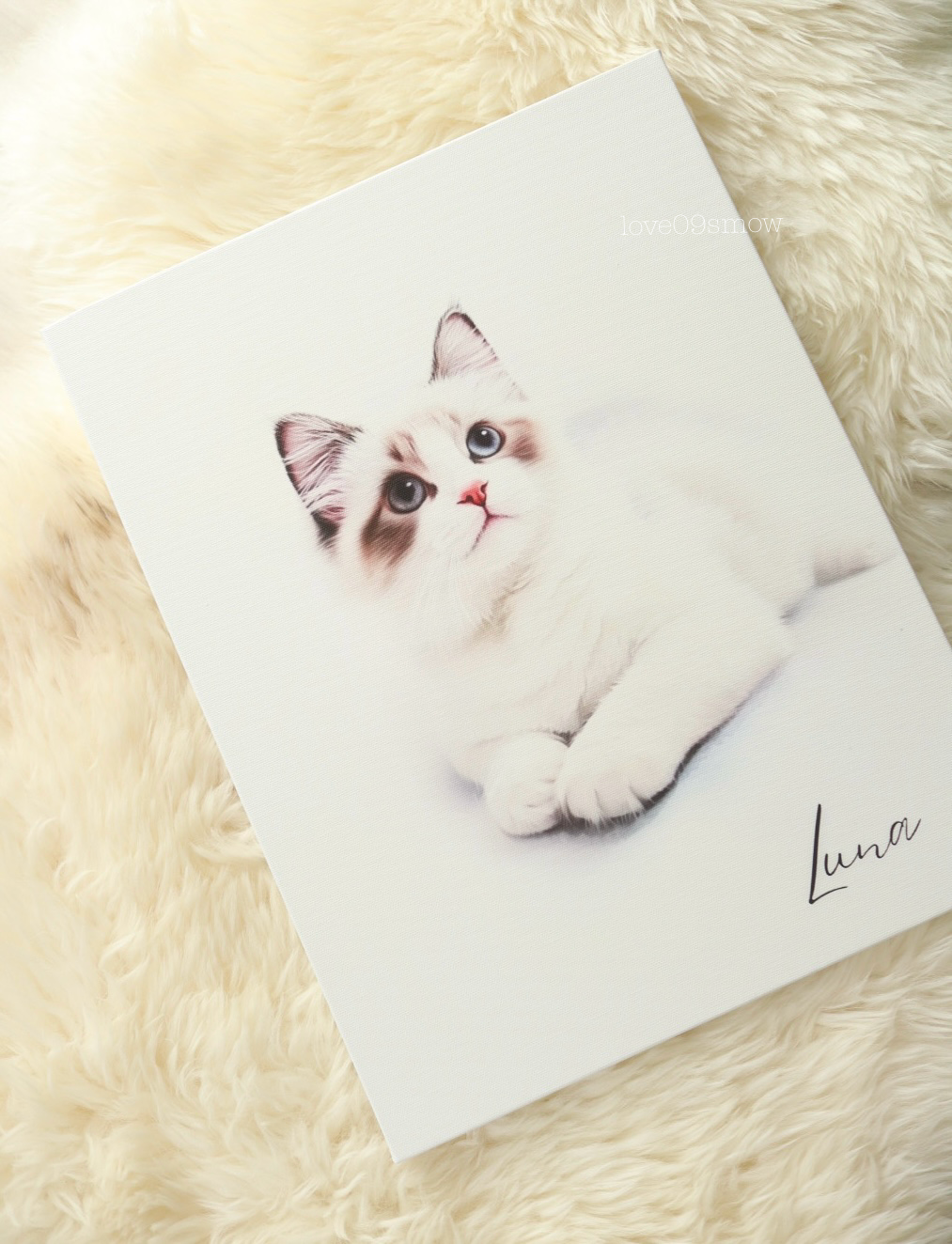 選んだ写真は半年頃のルナちゃんだけど、柔らかい毛並みやキレイな瞳までそっくり♡少しあどけない表情までも優しく引き立ててくれて感動したし、見た瞬間、思わず笑顔になったよ♡