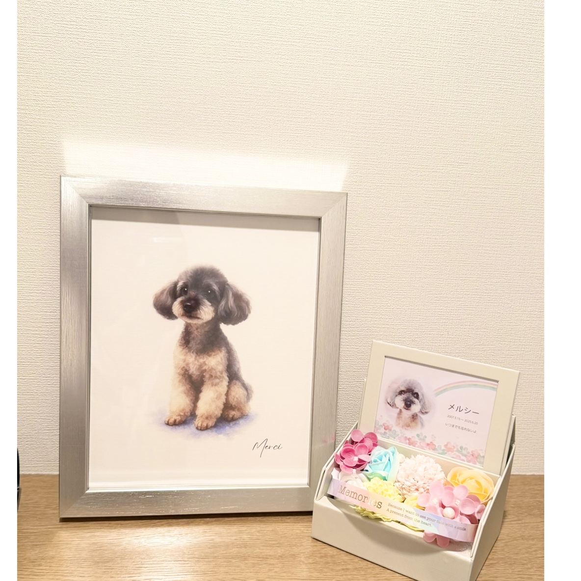なんとMerciが虹の橋を渡ってからちょうど1ヶ月の月命日の日に、こちらのアートが届きました。