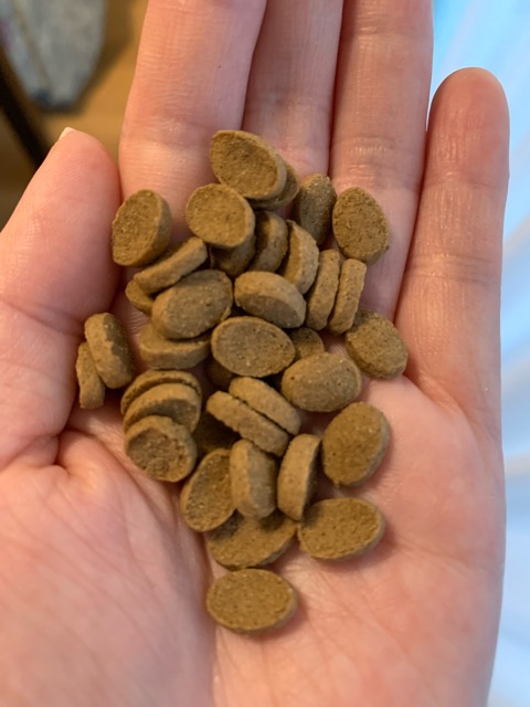 小粒でノンオイルコーティングなのでべたつきもなく、歯ごたえも良さそうなのですが、残念ながらありすはフードを噛むことが出来ません。一粒ずつ飲み込んでいきます。なので4,5粒手のひらに置いてゆっくり食べてもらうというワンコ仲間の間では聞いたことがない食べ方をします。食いつき率95%の残り5%に入ってしまうのですが、ゆっくりゆっくり食べてもらっています。金の旨味をガツガツ食べるワンコの動画を見るたびに羨ましくもありますが、ご飯の時間はコミニュケーションの時間だと思ってありがたくお世話しております(笑)