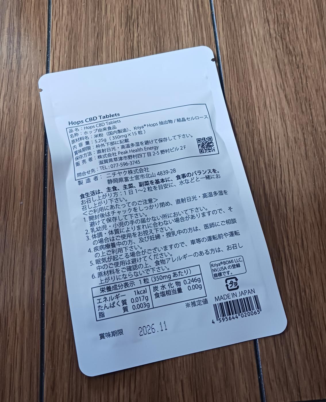 「kriya® Hops CBD Tablets」は、国産無農薬米から作られた米粉をベースに、ホップ由来成分を配合したタブレットタイプの商品です。水飴などの添加物を使わず、シンプルな原料で作られている点も安心感がありました。