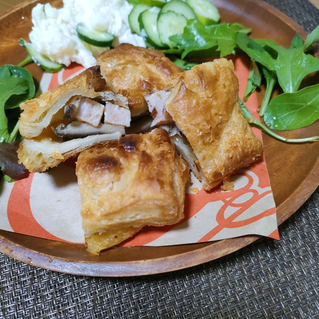サクサクパイ𓈒𓂂𓏸 "吉野原木しいたけしめじ ベーコンチーズパイ" 可愛い箱で冷凍で届きました😳 ...