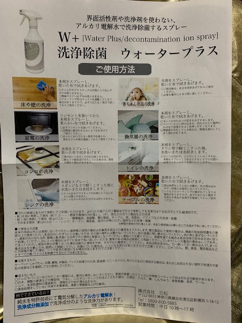 特許水の洗浄除菌スプレー、ウォータープラスをお試しさせていただきました。